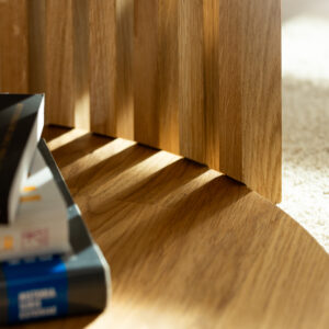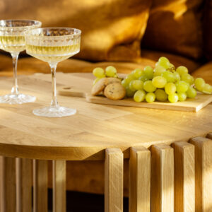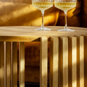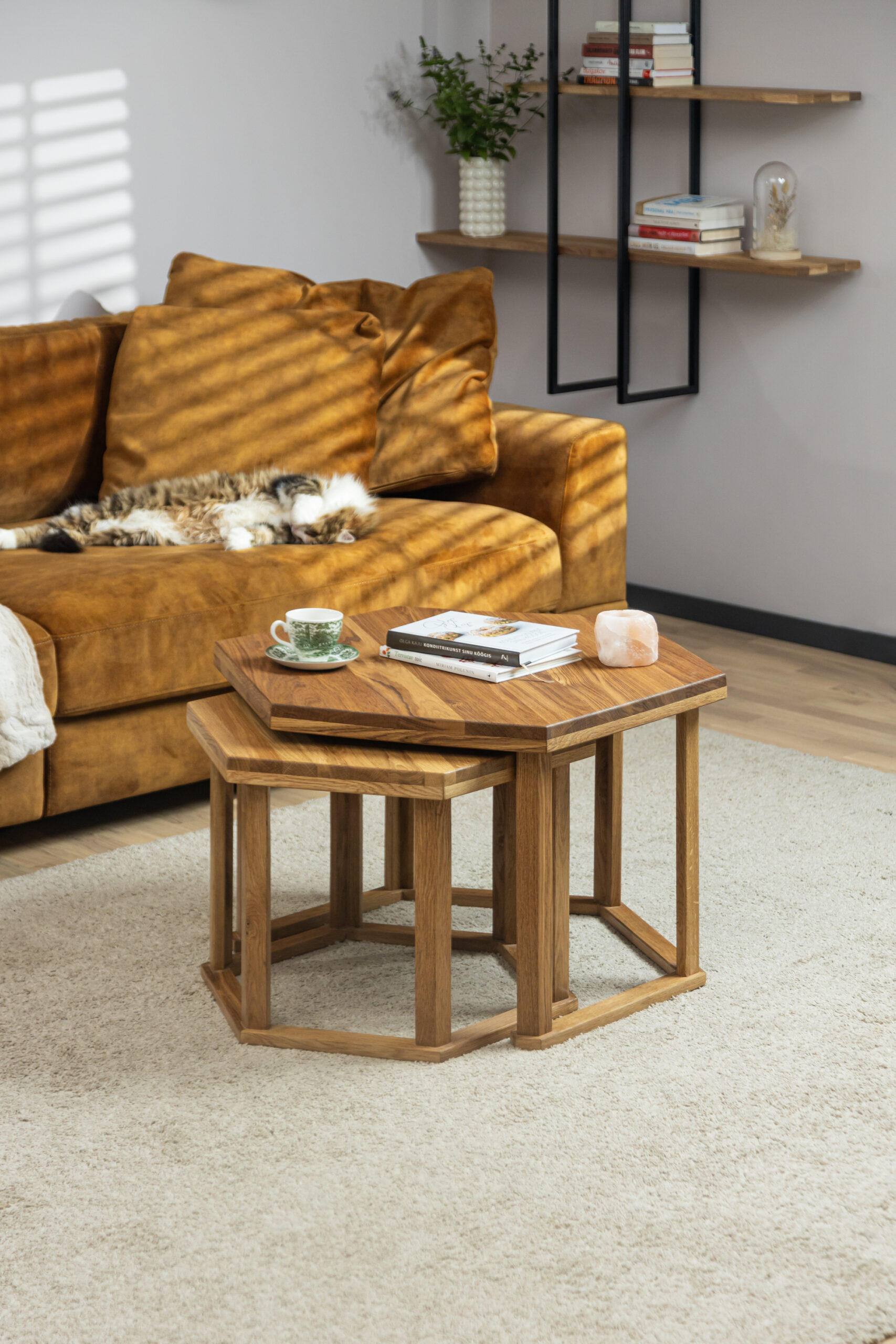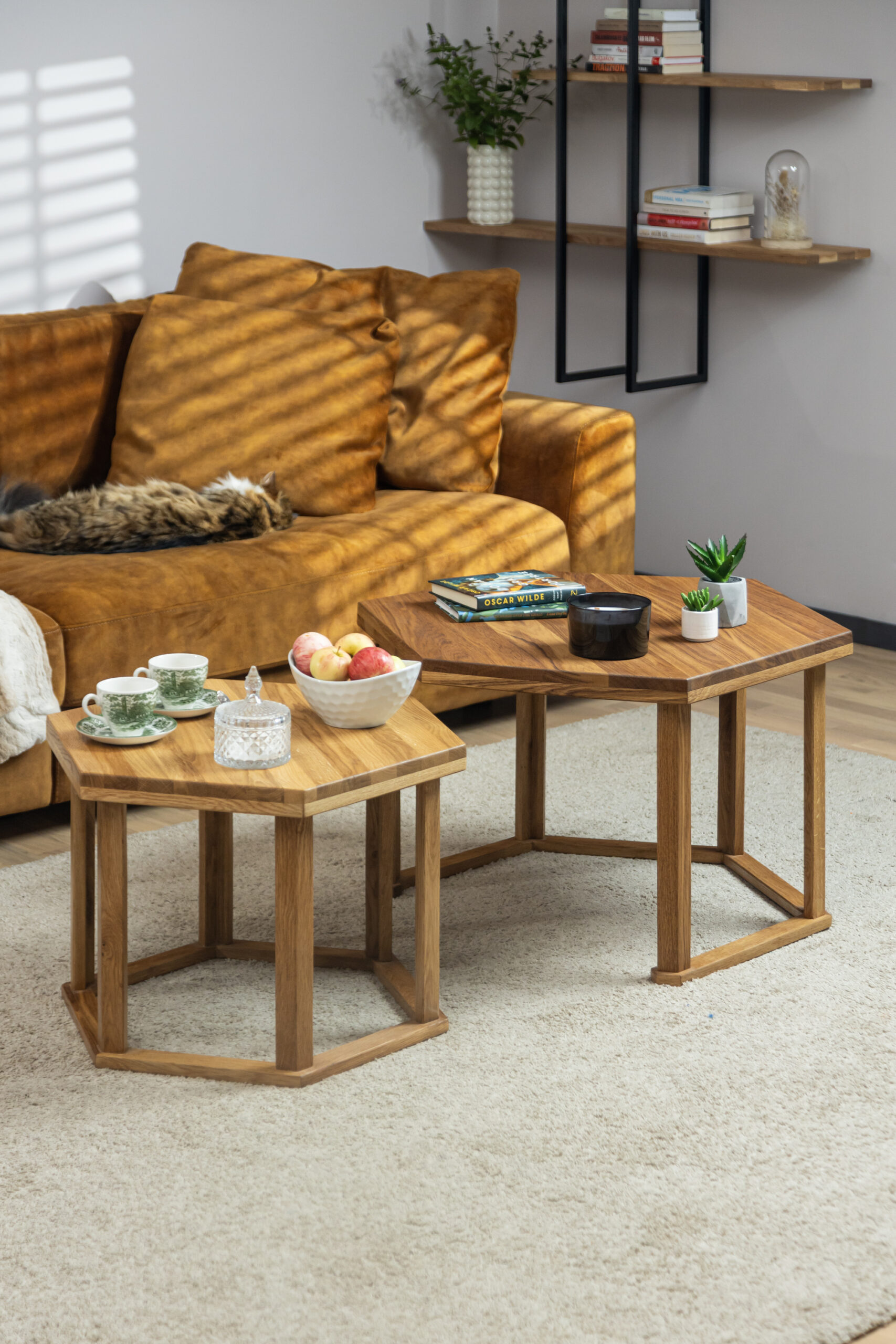 Mid-century modern style coffee table set HEX, made from 100% solid oak wood. The tables are finished with natural oil, highlighting the oak’s natural color and grain. A practical and stylish addition to your home or office.